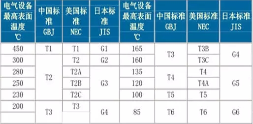 (3)引燃某種介質的溫度分組的劃分。主要分為T1-450℃<T、T2-300<T≤ 450℃、T3-200<T≤300℃、T4-135<T≤200℃、T5-100<T≤135 、T6-85<T≤100℃。