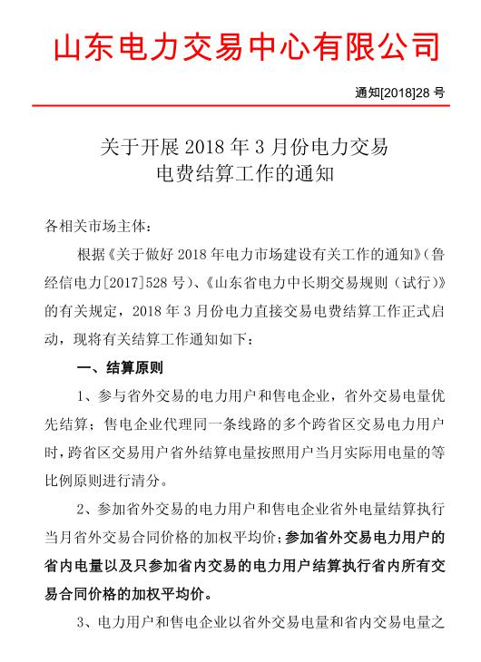 日前,山東電力交易中心發(fā)布《關(guān)于開展2018奶奶3月份電力交易電費結(jié)算工作的通知》(以下簡稱“通知”)。通知中稱,參與省外交易的電力用戶和售電企業(yè),省外交易電量優(yōu)先結(jié)算。參加省外交易電力用戶的省內(nèi)電量以及只參加省內(nèi)交易的電力用戶結(jié)算執(zhí)行省內(nèi)所有交易合同價格的加權(quán)平均價。詳情如下: