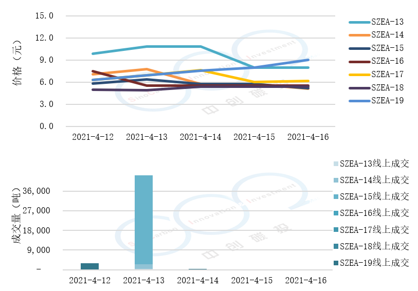 • 線上成交價最低為4.94(產品SZEA-18),最高為10.82元(產品SZEA-13),平均碳價為7.00元(平均碳價為各產品價格加權得出)。