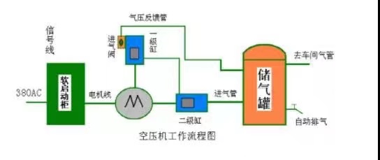 如空壓機工作流程圖所示:??? 螺桿壓縮機的工作原理可分為進氣,壓縮和排氣三個過程。隨著轉(zhuǎn)子旋轉(zhuǎn),每對相互嚙合的齒相繼完成相同的工作循環(huán)。?