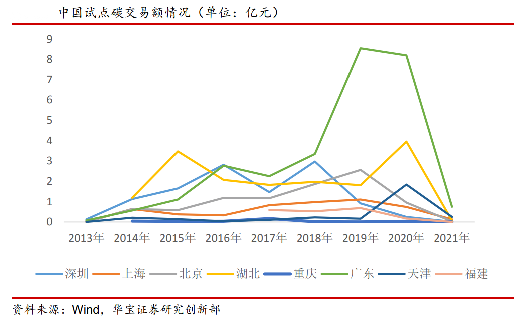 目前,全國共有8個地區在開展碳排放權交易試點,包括:北京、天津、上海、重慶、湖北、廣東、深圳、福建。截至2020年11月,試點碳交易市場累計配額成交量約為4.3億噸CO?e,累計成交額近100億元人民幣。