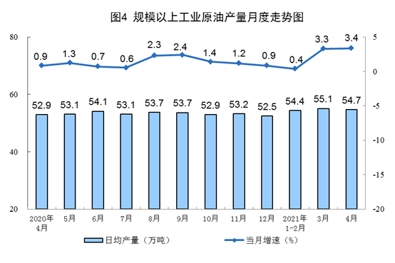 ? ? ? ?原油生產(chǎn)平穩(wěn),加工量保持增長。4月份,生產(chǎn)原油1641萬噸,同比增長3.4%,比2019年4月份增長4.3%,兩年平均增長2.1%,日均產(chǎn)量54.7萬噸。加工原油5790萬噸,同比增長7.5%,比2019年4月份增長8.3%,兩年平均增長4.1%,日均加工193.0萬噸。
