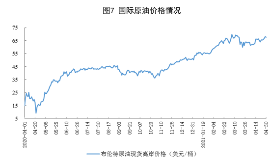 ? ? ? ?原油進(jìn)口由升轉(zhuǎn)降,國際原油價格有所上漲。4月份,進(jìn)口原油4036萬噸,同比下降0.2%;1-4月份,進(jìn)口原油17958萬噸,同比增長7.2%。4月30日布倫特原油現(xiàn)貨離岸價格為67.73美元/桶,比3月31日的63.52美元/桶上漲6.6%。
