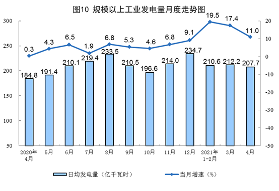 ? ? ? ?電力生產(chǎn)較快增長。4月份,發(fā)電6230億千瓦時,同比增長11.0%,比2019年4月份增長11.3%,兩年平均增長5.5%,日均發(fā)電207.7億千瓦時。1-4月份,發(fā)電25276億千瓦時,同比增長16.8%,比2019年1-4月份增長10.9%,兩年平均增長5.3%。