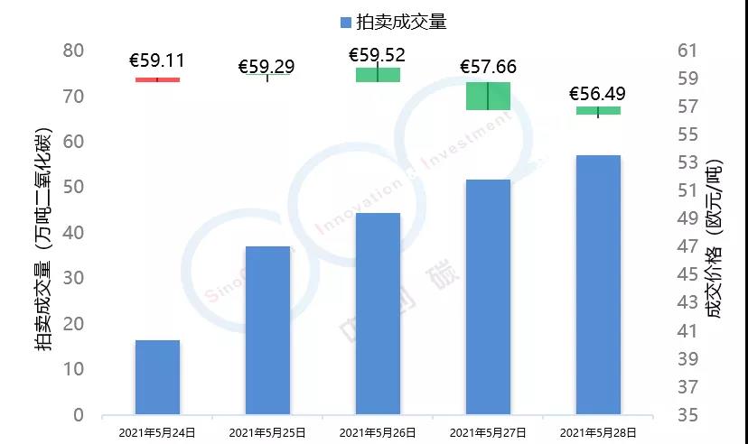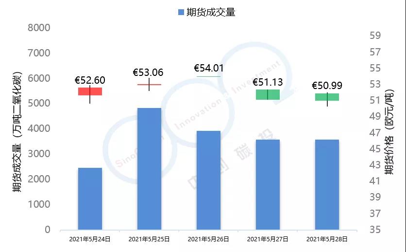2021年5月24日至5月28日,由于全球能源市場表現較為疲軟,市場投資者對于配額需求的預期不景氣,歐盟碳市場在本周總體呈現下跌趨勢,在本周三漲至53.59歐元/噸的頂峰后,隨即下跌近5個點,最終收于50.95歐元/噸,回落至接近本月初水平。英國碳市場自上周三開市后,在本周迎來交易的第一個整周,在短期試探了59.52歐元/噸的碳價后,英國碳價逐步回落至56.49歐元/噸,該趨勢與歐盟碳市場基本保持一致。本周歐盟碳市場期貨成交量達到1.84億噸,配額拍賣量為平均每天300萬噸左右。英國碳市場本周拍賣成交量達到207萬噸。據悉,英國政府正在考慮增加2021年英國碳市場配額的拍賣供應。
