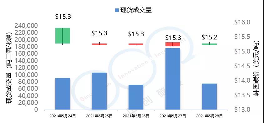 2021年5月24日至5月28日,本周韓國碳價延續上周的下跌趨勢,由15.3美元/噸下跌至15.2美元/噸。本周韓國碳市場成交量達到52萬噸,遠高于上周7萬噸的水平。