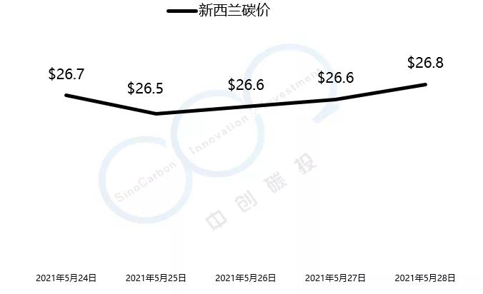 2021年5月24日至5月28日,新西蘭碳價本周由26.7美元/噸小幅漲至26.8美元/噸。
