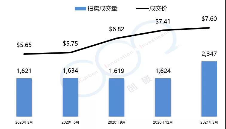 RGGI碳市場的初始配額發放以拍賣為主,每個季度舉行一次拍賣。2021年第一季度拍賣成交均價為$7.60美元,較上一季度漲幅為2.5%。由于弗吉尼亞州的加入,RGGI總成交量創歷史新高,達到了2347萬噸。以下是由中創碳投統計的RGGI近一年的交易情況。