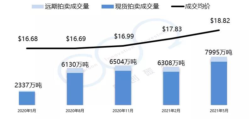 加州-魁北克碳市場的初始配額發放以拍賣為主,每個季度舉行一次拍賣。2021年5月的第27次拍賣均價與總成交量創歷史新高。拍賣均價為18.82美元,較上一季度漲幅為5.6%,總成交量為7995萬噸。以下是由中創碳投統計的加州-魁北克碳市場近一年的交易情況。